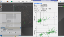 • First, I have attached two screenshots using the Flaming Star nebula from Fast Track including the settings I used for SPCC after DBE. The fit of Image R/G to Catalog R/G looks very similar to the video. However, the fit of Image B/G to Catalog B/G is worse, more scatter, and the slope is much less. In one screenshot I show the STF linked, which looks too blue to my eye comparing to the video, and the second STF is unlinked and looks better to my eye, less blue and more color balance.